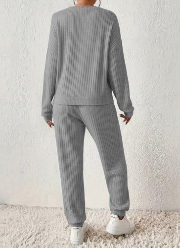 Dwuczęściowy damski komplet z bluzką i spodniami na ramiączkach i z długim rękawem oraz dekoltem w serek