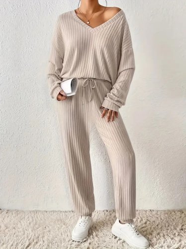 Dwuczęściowy damski komplet z bluzką i spodniami na ramiączkach i z długim rękawem oraz dekoltem w serek