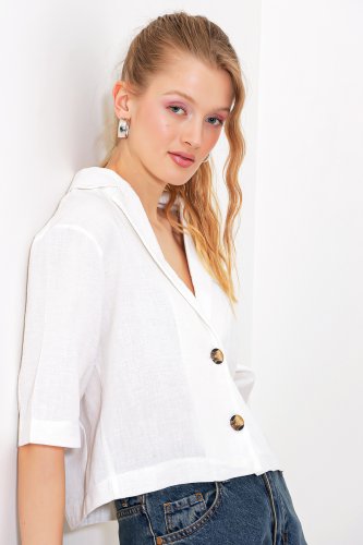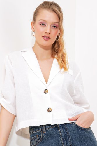 Biała, oversize'owa, lniana marynarka zapinana na dwa guziki, 0706