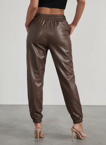• Damskie skórzane spodnie z wysokim stanem, z elastyczną gumką i guzikami z przodu