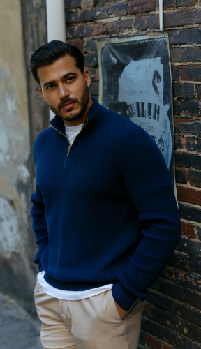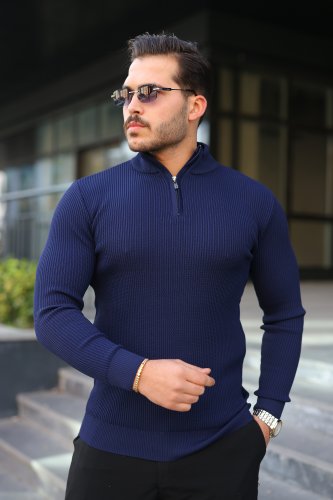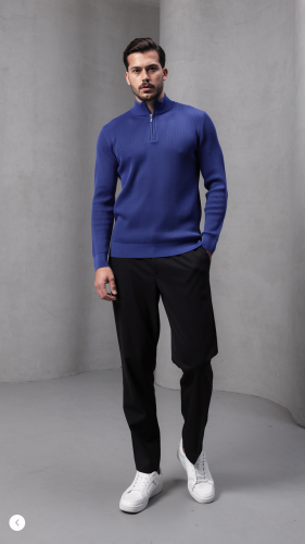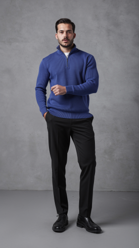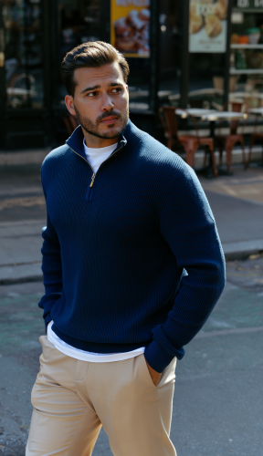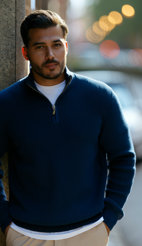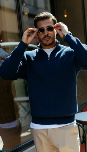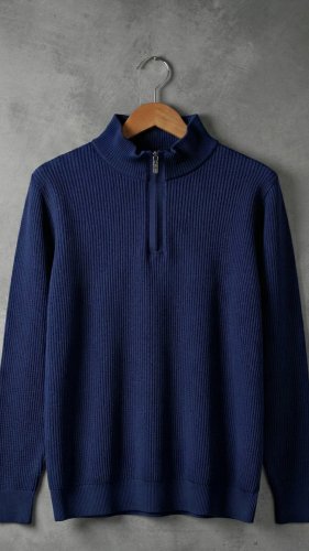 • Męski sweter z golfem, kołnierzem zapinanym na zamek i długim rękawem