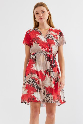 2502 Sukienka z szyfonu z krótkim rękawem we wzór – czerwona