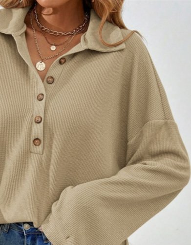 Damska bluzka z długim rękawem i kołnierzykiem zapinana na guziki, casualowa, waflowa