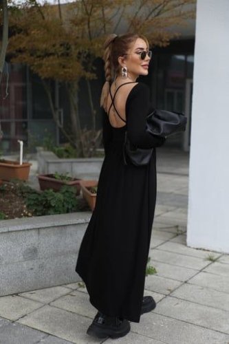 • Długa sukienka damska z dekoltem w łódkę, odkrytymi plecami i rozcięciem