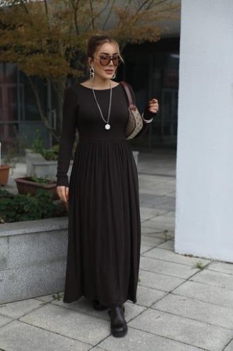 Długa sukienka damska z dekoltem w łódkę, odkrytymi plecami i rozcięciem