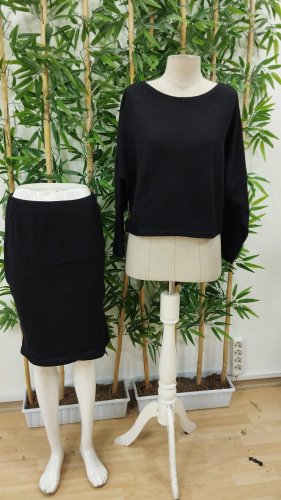 • Bluzka damska dwuczęściowa z długim rękawem i spódnicą, z odkrytym dekoltem i podwyższoną górą