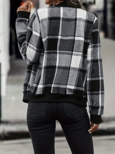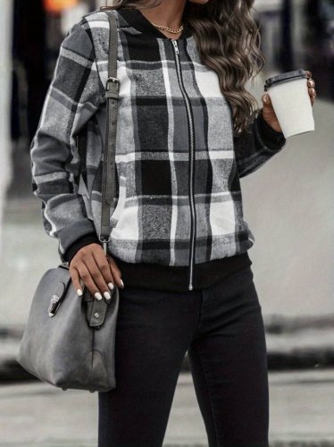 Kurtka damska w kratę z długim rękawem i zamkiem błyskawicznym z przodu