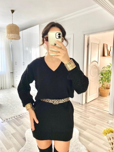 • Damska sukienka mini z dzianiny z długim rękawem i dekoltem w serek