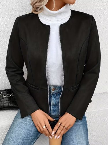 • Kurtka damska zamszowa z długim rękawem i okrągłym dekoltem, zapinana na suwak z przodu