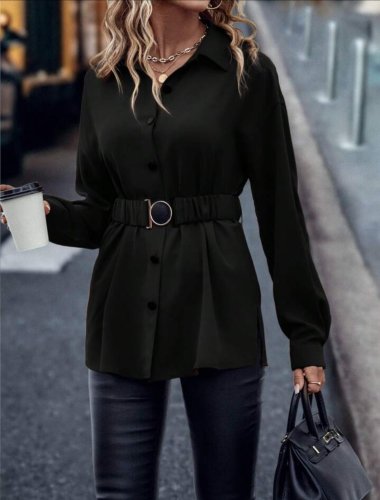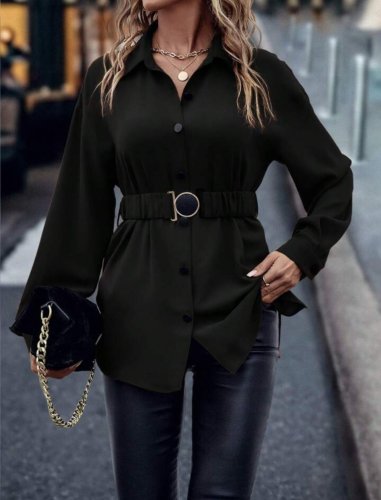 • Bluzka damska z długim rękawem, kołnierzykiem, zapinana z przodu na guziki i paskiem w talii, importowana z krepy