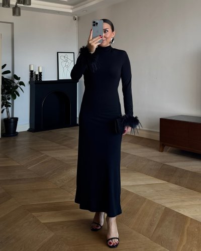 • Damska sukienka z długim rękawem i golfem z krepy z ozdobnym piórkiem na mankiecie