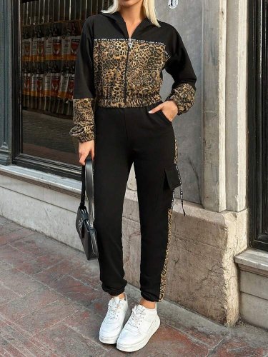 Dwuczęściowy komplet damski z długim rękawem, kapturem i nadrukiem w panterkę, wykonany z wiskozy, składający się z bluzki i spodni