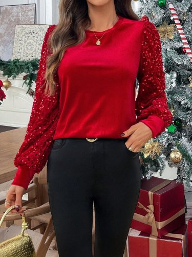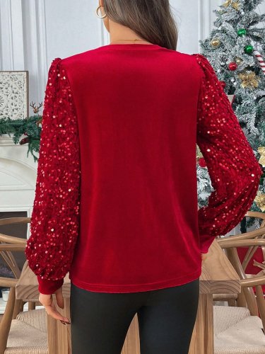 • Bluzka damska z długim rękawem i okrągłym dekoltem, z aksamitnymi rękawami z cekinami