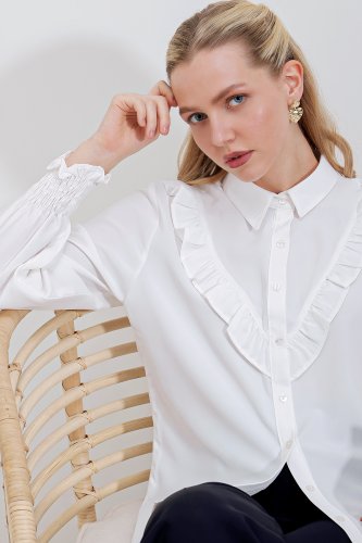 20223 Koszula z długim rękawem z falbanką – biała