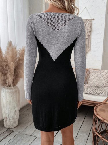 Damska sukienka mini z długim rękawem i dekoltem w łódkę, dwukolorowa, dzianinowa