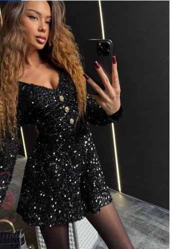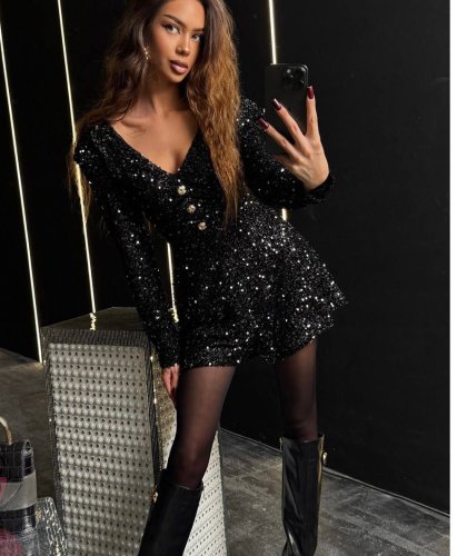• Sukienka damska z długim rękawem i dekoltem w serek, zapinana na guziki i ozdobiona cekinami