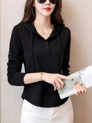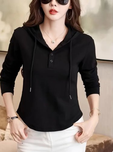 Bluzka damska z długim rękawem, kapturem, ściągaczem i guzikami, wykonana z wiskozy o splocie dwunitkowym