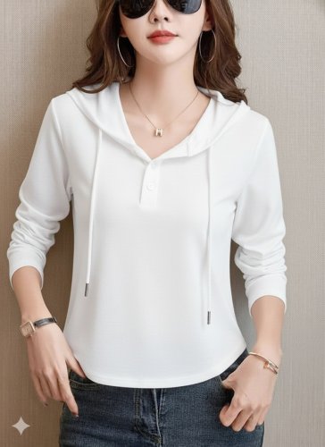 • Bluzka damska z długim rękawem, kapturem, ściągaczem i guzikami, wykonana z wiskozy o splocie dwunitkowym