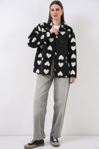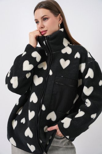 55446 Kurtka-płaszcz oversize z pluszu zapinana na zamek - ciemnoczarny