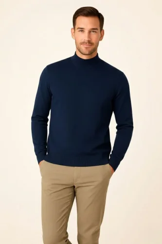 • Męski sweter dzianinowy z półgolfem, miękka, teksturowana bawełna o drobnym splocie, długie rękawy, wygodny, regularny krój - granatowy