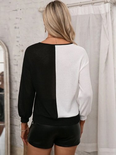 Bluzka damska z długim rękawem i dekoltem w serek, dwukolorowa, dzianinowa