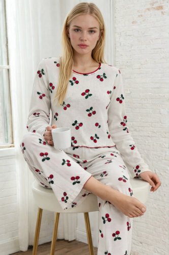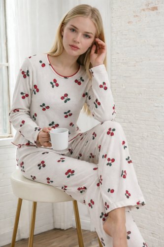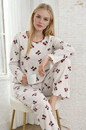 • Damski komplet składający się z bluzki z długim rękawem i okrągłym dekoltem oraz piżamy.