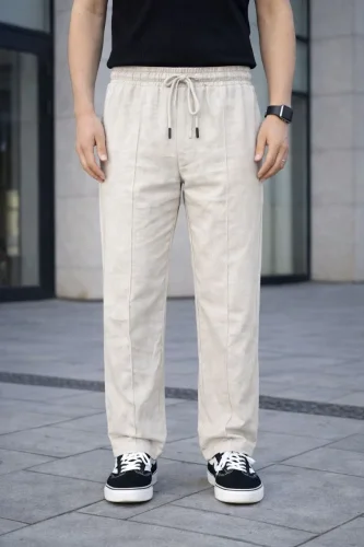 • Męskie lniane spodnie dresowe typu buggy z kieszeniami i przeszyciami, luźny krój – kremowe