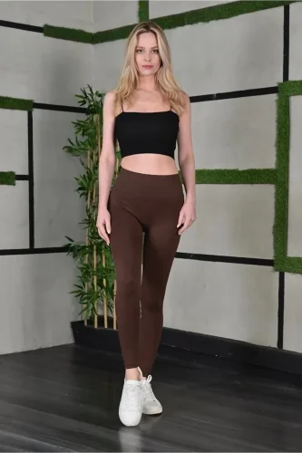 • Legginsy sportowe z wysokim stanem i dodatkowym wyprofilowaniem z lycry, dopasowane do codziennego noszenia – brązowe