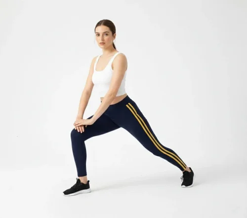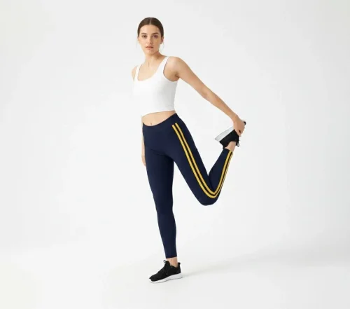 • Leginsy z lycry z żółtym paskiem po bokach – czarne