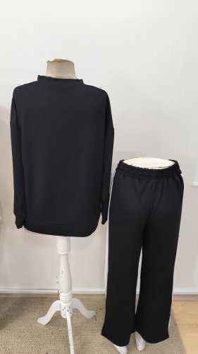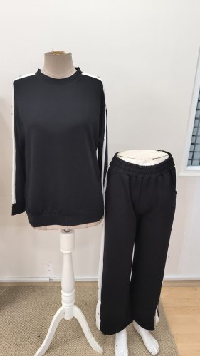 • Dwuczęściowy komplet damski składający się z bluzki i spodni z wiskozy dwunitkowej, z długim rękawem, okrągłym dekoltem, zapinanych na guziki.