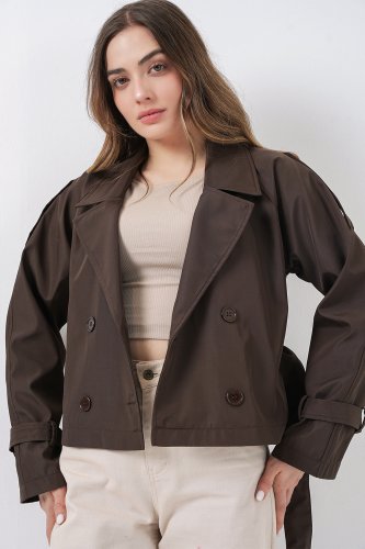 Krótki trencz z paskiem 5970 - Ciemny brąz