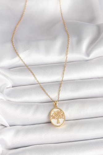 • Naszyjnik damski w kolorze złotym ze stali 316L z cyrkoniami, białą emalią i rzeźbionym w drewnie portretem