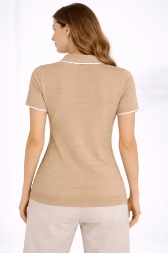 Koszulka z dzianiny z kołnierzykiem, bez guzików, z otwartym dekoltem, prążkowana, z krótkim rękawem, regularny krój – beżowa