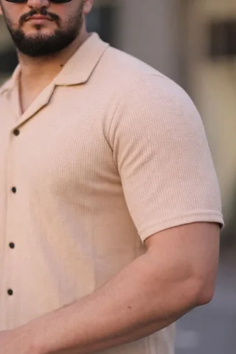Koszula męska z krótkim rękawem i kołnierzykiem typu waffle z materiału zapinanego na guziki, o regularnym kroju – beżowa