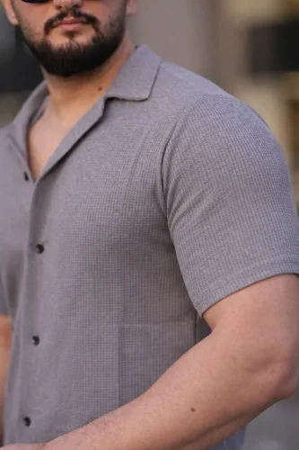 Męski komplet koszulowy z otwartym kołnierzykiem i guzikami, regularny krój, 2 części, granatowo-szary