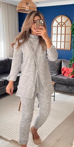 • Komplet damski składający się z bluzki z długim rękawem i golfu oraz spodni zapinanych z przodu na guziki, miękki komplet dwuczęściowy.