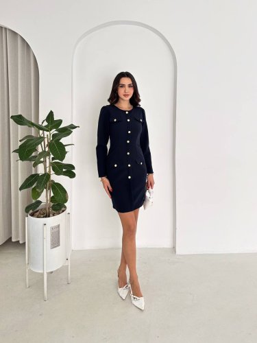 • Damska sukienka mini z kołnierzykiem rowerowym, kieszenią i złotymi guzikami, podwójna tkanina.
