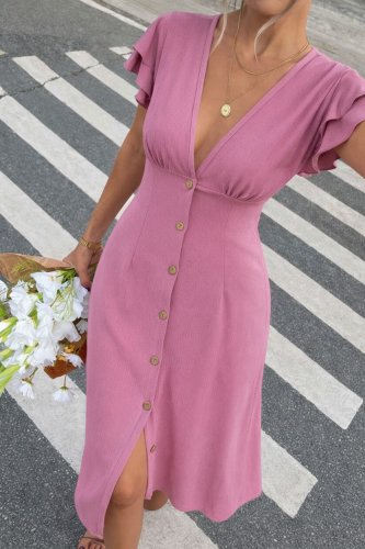 Damska sukienka midi z krótkim rękawem, dekoltem w serek, zapinana na guziki z przodu i marszczona