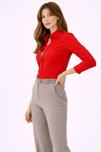 • Koszula z długim rękawem i klasycznym kołnierzykiem zapinanym na guziki, idealna na co dzień i do biura - Czerwona