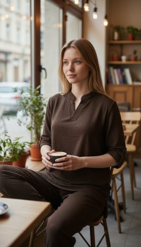 • Dwuczęściowy komplet damski: bluzka i spodnie zapinane na rozkładane guziki i ze stójką, uszyty z lnu Sofia.