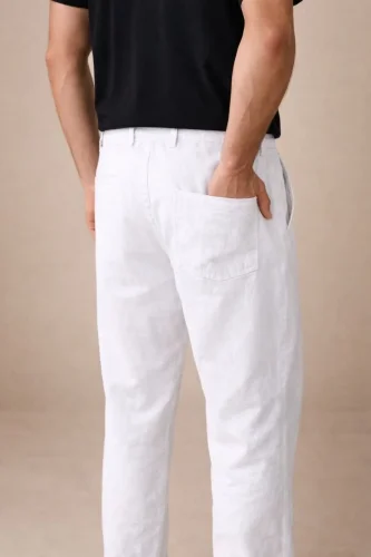 • Męskie lniane spodnie z kieszeniami, gumką w pasie, sznurkiem ściągającym i zamkiem błyskawicznym z przodu – białe