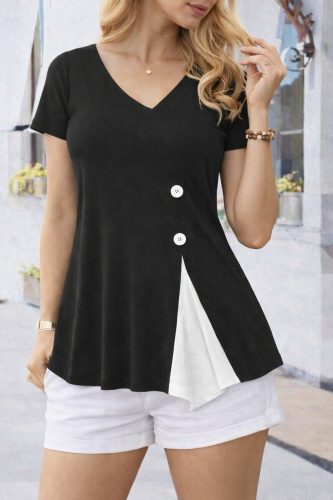 • Bluzka damska z krótkim rękawem, asymetryczna, z wiskozy, z dekoltem w serek i ozdobnymi guzikami