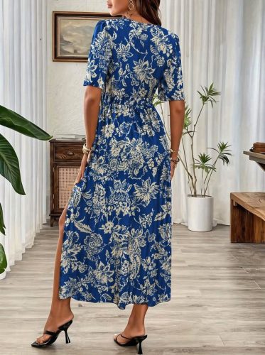 Sukienka damska z krótkim rękawem, dekoltem w serek, elastyczną talią, rozcięciem, długim rękawem i nadrukiem w panterkę.